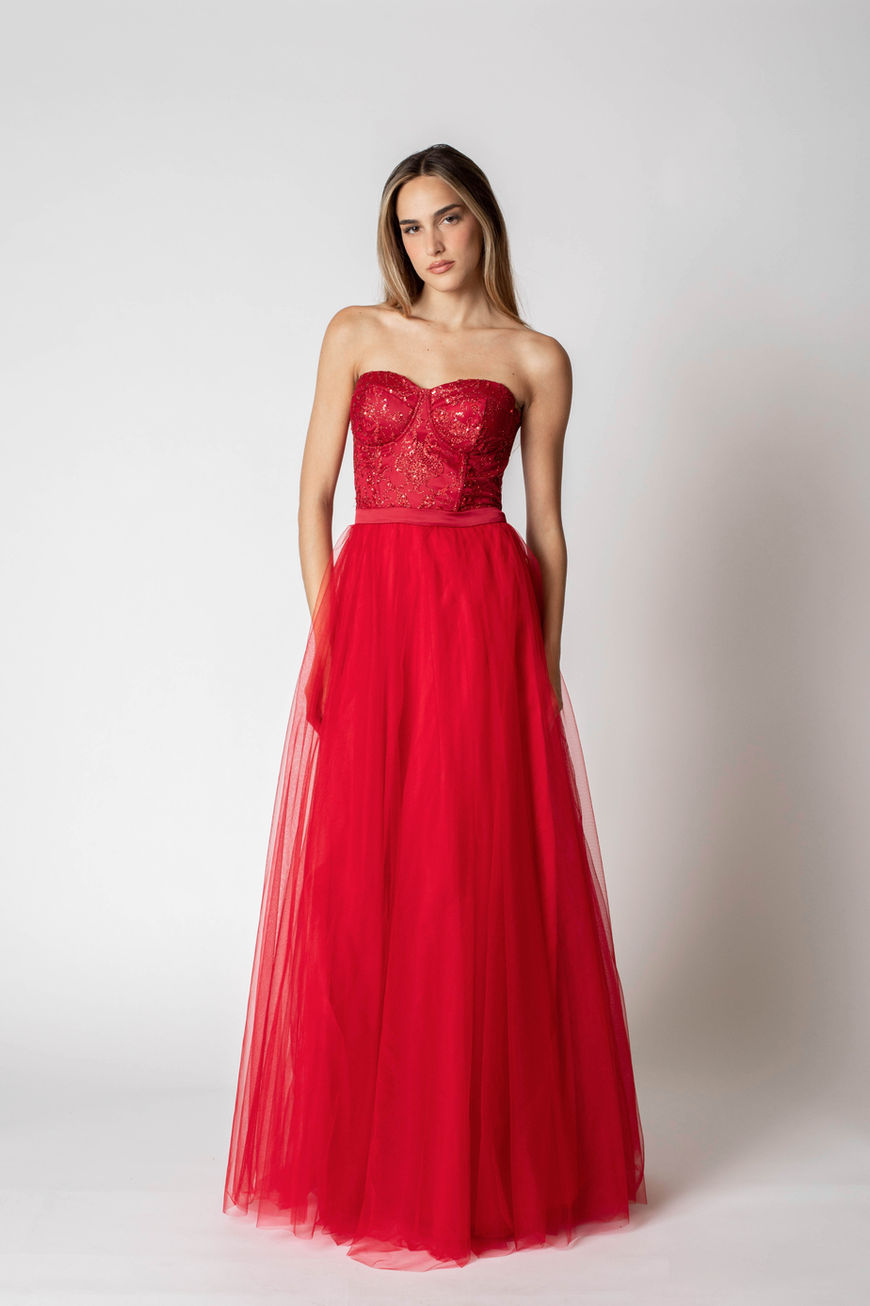 Dettagli: Bustino ricamato, spalline regolabili, gonna ampia in tulle, profondo spacco, chiusura con zip invisibile