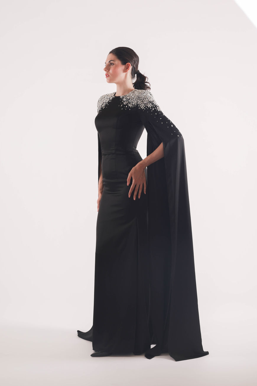 Abito lungo dalla linea a sirena, impreziosito da un ricamo gioiello che decora le spalle e il décolleté con luminosità scenografica. Le maniche lunghe si aprono in una mantella fluida che cade fino a terra, creando un movimento elegante e teatrale ad ogni passo. La schiena scoperta, con apertura a goccia, aggiunge un tocco di sensualità equilibrata alla silhouette strutturata.