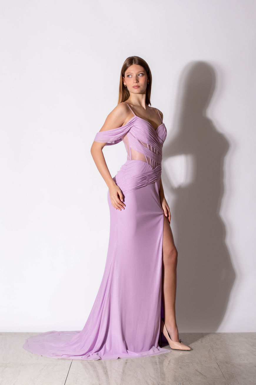 Dettagli: drappeggio a fasce, inserti in tulle trasparente, maniche off-shoulder