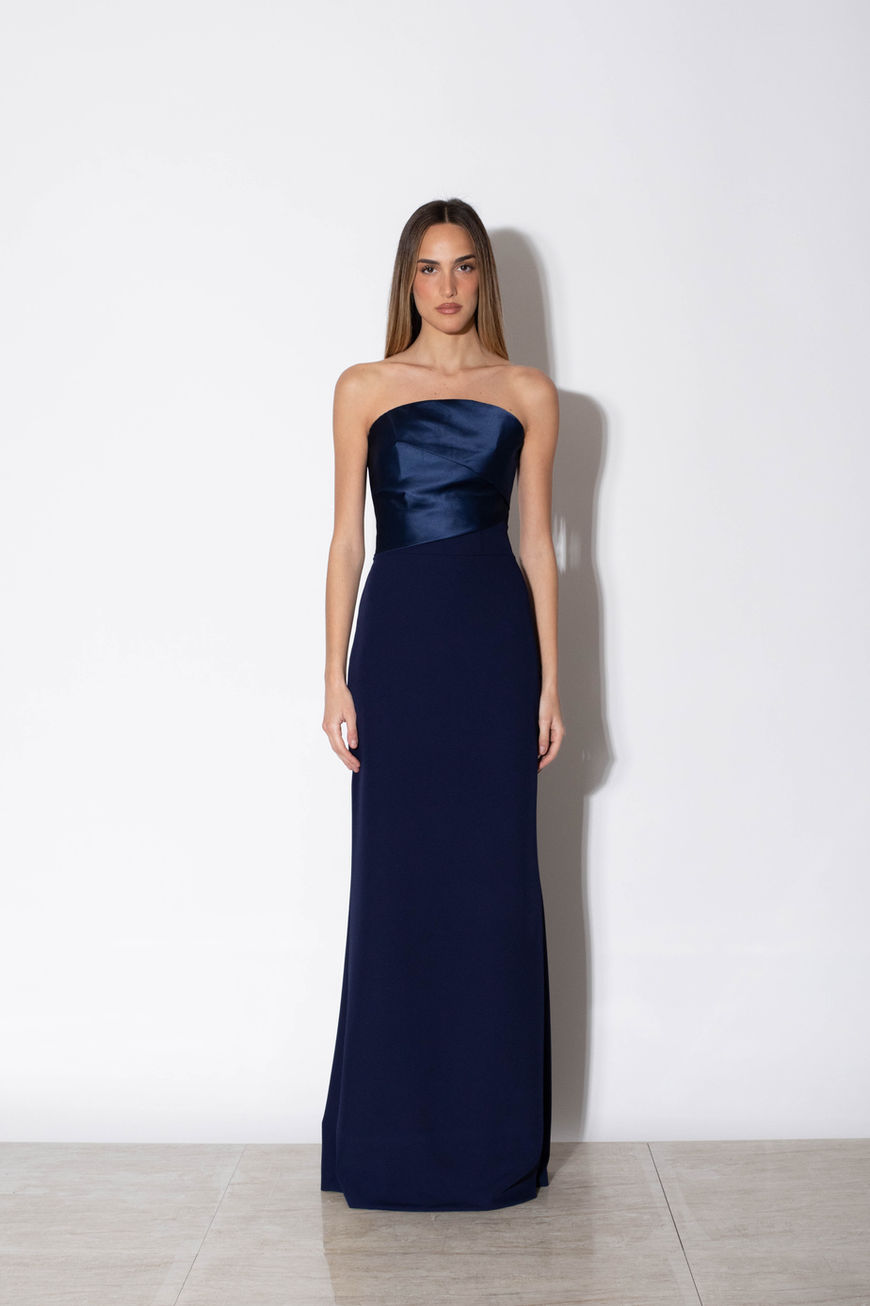 La gonna lunga in cady scivola fluida lungo la figura, mantenendo una silhouette slanciata ed equilibrata. La chiusura posteriore con stringhe consente di regolare la vestibilità sul busto, aggiungendo un dettaglio sofisticato e funzionale.