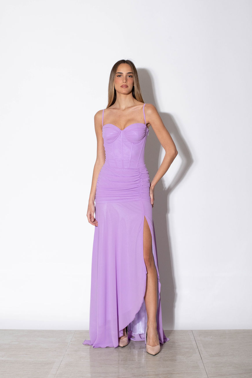 Il bustier strutturato valorizza il décolleté, mentre l’arricciatura sul bacino definisce la silhouette con un effetto morbido e armonioso.